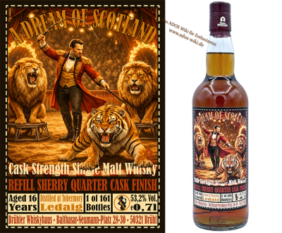 Dieser 16-jährige Ledaig aus der Tobermory-Destillerie erhielt ein Refill Sherry Quarter Cask Finish. Durch das kleinere Fass intensiviert sich der Einfluss des Sherrys, ohne die typische, markant-erdige Ledaig-Rauchigkeit zu überdecken. Im Vergleich zu klassischen Sherry-Ledaigs wirkt diese Abfüllung etwas strukturierter und würziger, mit klarer Balance zwischen Torf, maritimer Frische und dunkler Fasssüße. Präsentiert wird die Abfüllung im Rahmen des „Whisky Circus 2026“, bei dem das Brühler Whiskyhaus in Nürnberg, Hamburg und Schwetzingen Station macht. Neben neuen „Artisten“ der A Dream of Scotland-Serie werden auch Abfüllungen der Hammerschmiede aus dem Harz sowie ausgewählte Raritäten ausgeschenkt.